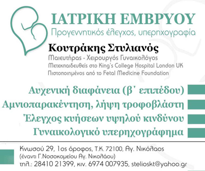 Υπερηχογράφημα αυχενικής διαφάνειας,Αναλυτικό υπερηχογράφημα εμβρύου,Έλεγχος κυήσεων υψηλού κινδύνου,Δέχεται Δευτέρα & Τρίτη 09:00-15:00,Πέμπτη 09:00-21:00.Δέχεται και στο "Μητέρα" κατόπιν ραντεβού.