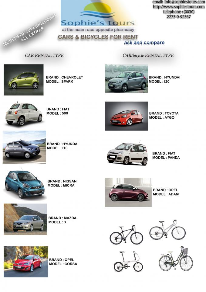 Το Γραφείο Ενοικίασης Αυτοκινήτων "Sophie's Tours" μετρά 4 χρόνια εμπειρίας στο χώρο και 35 χρόνια στον τομέα του τουρισμού. Θέλουμε οι πελάτες μας να είναι ικανοποιοιμένοι, ασφαλείς και αξιόπιστοι, αφού προσφέρουμε εγγυημένα καινούργια αυτοκίνητα, Jeep και ποδήλατα σε λογικές τιμές με την κατάλληλη ασφάλιση.