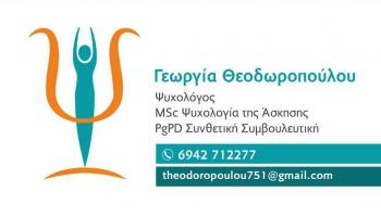 Η Γεωργία Θεοδωροπούλου σπούδασε Ψυχολογία στο Πάντειο Πανεπιστήμιο, και κατέχει άδεια άσκησης επαγγέλματος. Είναι κάτοχος του Μεταπτυχιακού Διπλώματος Ειδίκευσης στην «Ψυχολογία της Άσκησης» (δίγλωσσο) από το Τμήμα Επιστήμης Φυσικής Αγωγής και Αθλητισμού του Πανεπιστημίου Θεσσαλίας. Έχει εκπαιδευτεί και πιστοποιηθεί στη Συνθετική Συμβουλευτική, στις Μαθησιακές Δυσκολίες καθώς και στο συντονισμό Σχολών Γονέων. Εργάστηκε για πολλά χρόνια στην ιδιωτική εκπαίδευση. Σήμερα εργάζεται ως ψυχολόγος παρέχοντας Ατομική Συμβουλευτική-Ψυχολογική Υποστήριξη εφήβων, ενηλίκων και αθλητών καθώς και συντονισμό ομάδων γονέων. Επίσης, παρέχει συνεδρίες συμβουλευτικής μέσω διαδικτύου για όσους κατοικούν σε άλλα μέρη της Ελλάδας και στο εξωτερικό. Συνεχίζει την εκπαίδευσή της σε ψυχοθεραπευτικές μεθόδους. Είναι πιστοποιημένη εκπαιδεύτρια ενηλίκων και λειτουργεί ως εισηγήτρια εκπαιδευτικών προγραμμάτων σε θέματα ψυχικής υγείας και προσωπικής ανάπτυξης. Έχει συμμετάσχει ως εισηγήτρια σε πανελλήνια και διεθνή συνέδρια Αθλητικών Επιστημών και Ψυχολογίας και σε ημερίδες σχολείων. Είναι μέλος του Συλλόγου Ελλήνων Ψυχολόγων (Σ.Ε.Ψ.), της Ελληνικής Εταιρείας Ψυχολογίας της Άσκησης και του Αθλητισμού (Ε.Ψ.Α.Α.) καθώς και της European Federation of Sport Psychology (FEPSAC-Fédération Européenne de Psychologie des Sports et des Activités Corporelles).